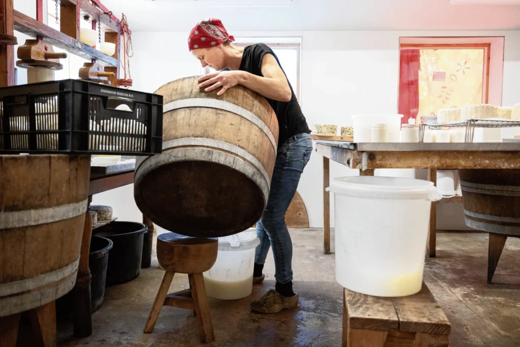 Doetie’s geitenboerderij in Jubbega (Friesland, Nederland) is een kleinschalige, ambachtelijke boerderijkaasmakerij waar liefde voor het boerenleven en respect voor de natuur hand in hand gaan. De boerderij wordt geleid door Doetie, die samenwerkt met een kleine groep toegewijde medewerkers om traditionele geitenkazen te maken met karakter en authenticiteit. De geiten op de boerderij zijn van het Toggenburger ras, een sterk, koudbestendig en natuurlijk grazend dier dat dankzij het uiteenlopende kruidenrijke grasland rondom de boerderij uitstekende melk levert. De weilanden rond Jubbega worden bewust niet bestrooid met kunstmest, waardoor er meer dan vijftig verschillende kruiden in het gras groeien — een rijkdom aan flora die zich rechtstreeks vertaalt naar de smaak van de melk en de kazen.